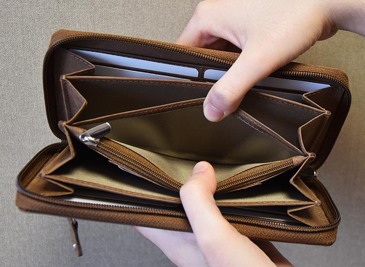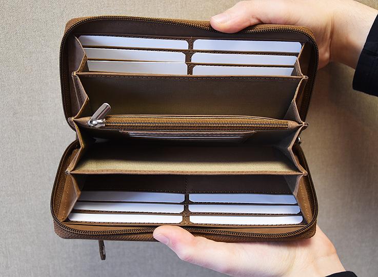 Die Geldbörse wird mit einem Reißverschluss verschlossen. Aufgeklappt befindet sich rechts und links jeweils an der Rückseite ein großes Einsteckfach. Davor jeweils quer 6 Kartensteckfächer. Es folgen insgesamt 4 große Fächer für Geldscheine, Handys etc. und mittig ein Münzfach, verschließbar mit einem Reißverschluss.