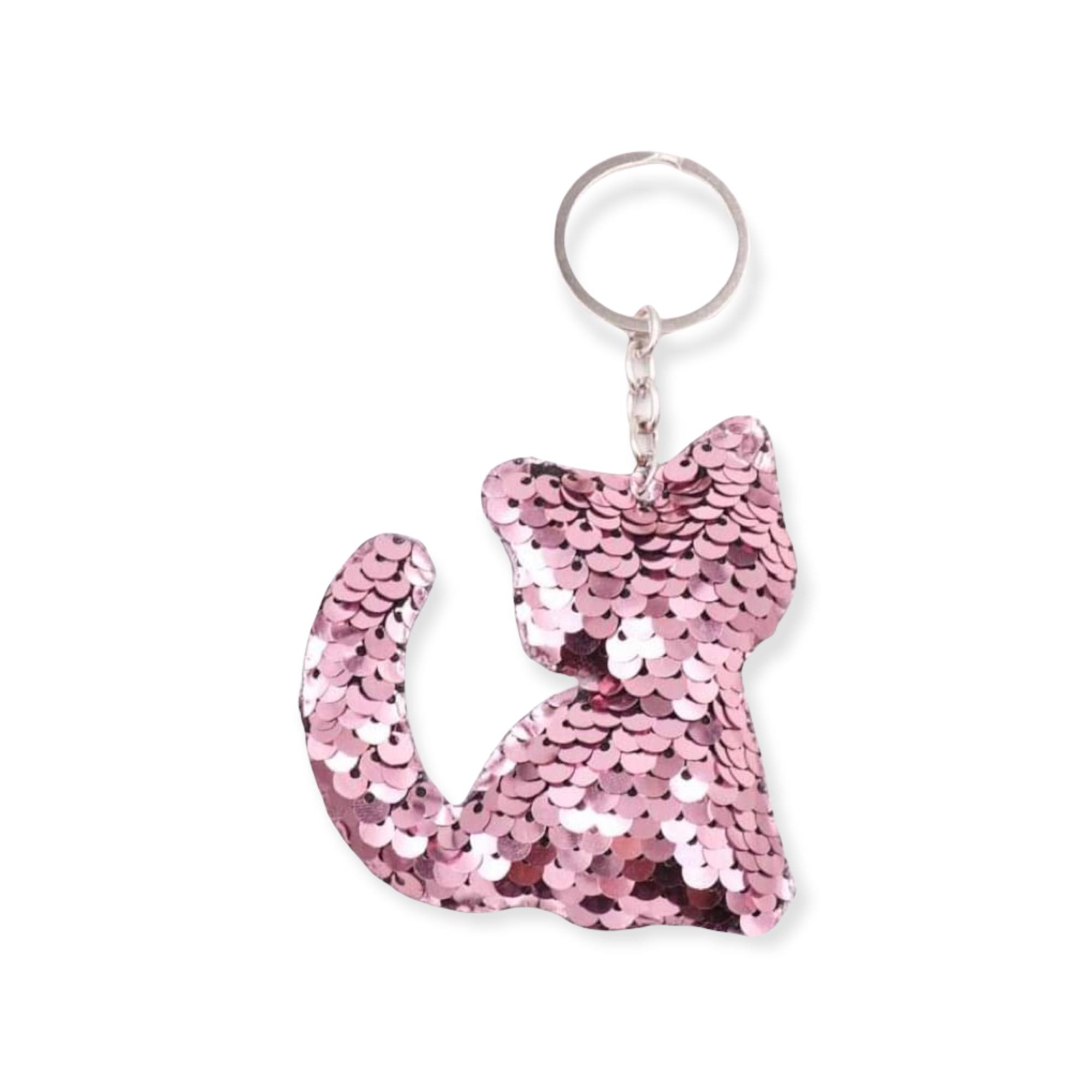Schillernder Schlüsselanhänger in Form einer Katze voller Pailletten.